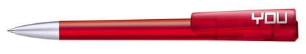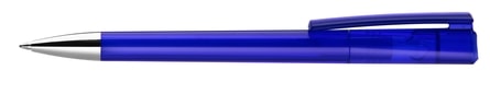 A twist action pen with a polished barrel and extra large frosted clip which comes in 2 matt and 10 transparent mix and match colours. A matt silver triangular top and matching nose cone. Choice of black or blue replaceable ink refill with a writing distance of up to 6000m.